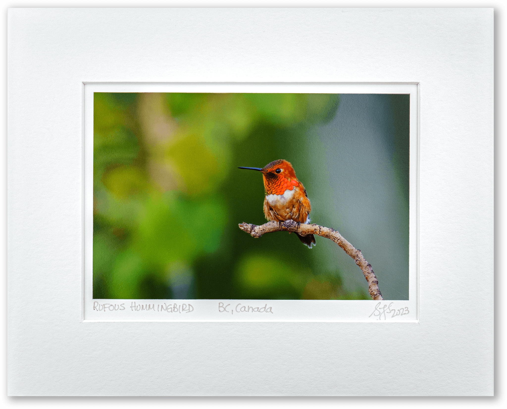 Vibrant colour giclée print of a rufous hummingbird perched on a branch, photographed in a rare moment of stillness by Stephanie in Williams Lake, British Columbia, Canada.